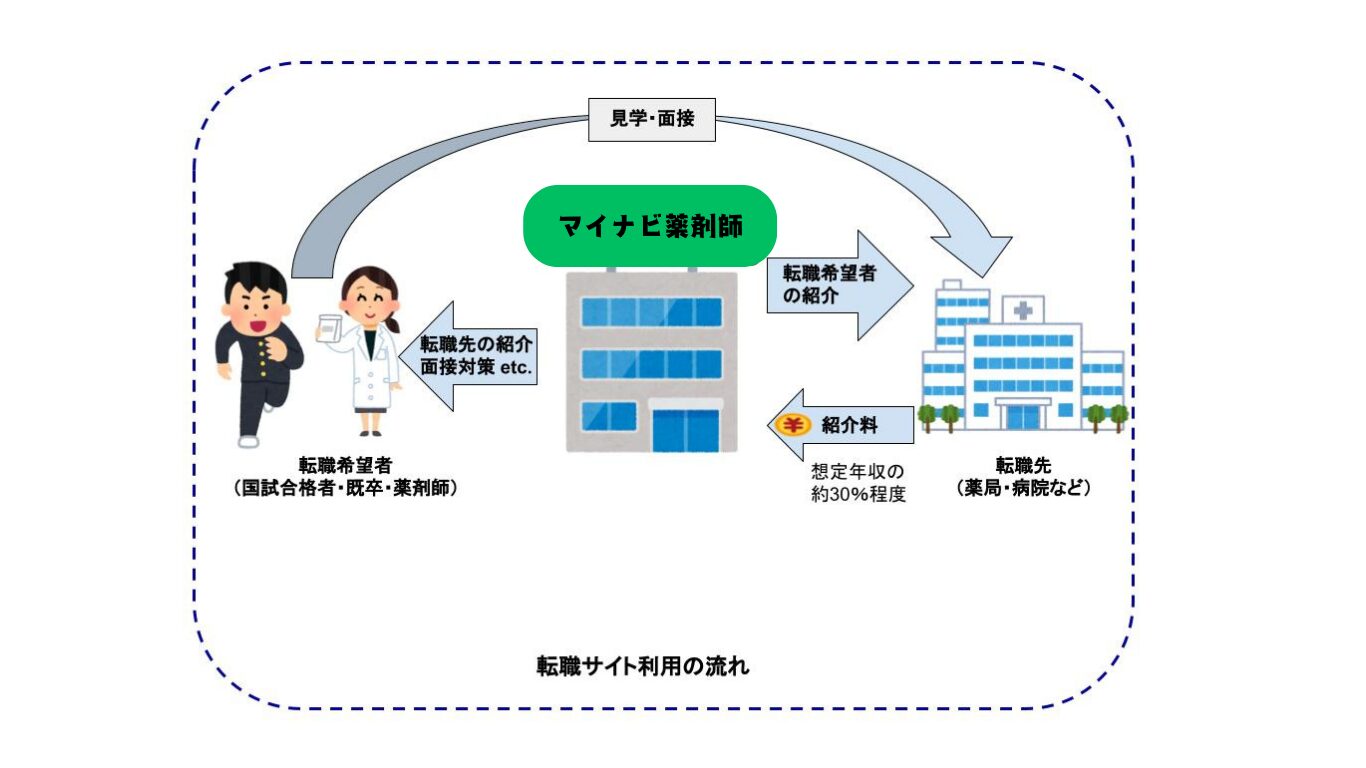 下記のように紹介料として、就職が決まった際に就業先から転職エージェントへ報酬が発生するため、国試合格者や薬剤師は完全に無料で利用することができます。